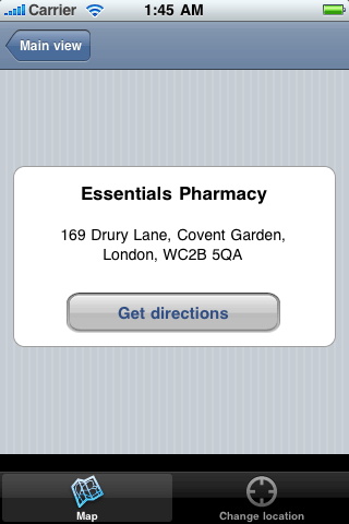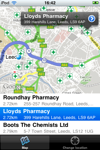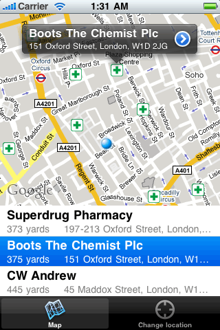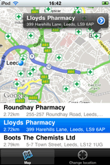 Find Pharmacies uses the built in GPS on the iPhone to get your current location, but can also locate an iPod Touch in built-up WiFi areas. If your location cannot be determined automatically then you can always enter your post code to get started. Please note that an internet connection is required to get location and map data.