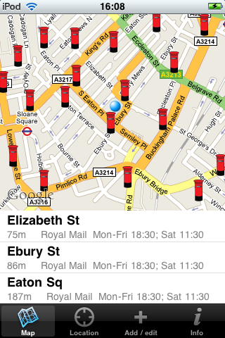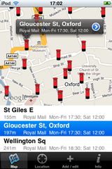 Find Postboxes uses the built in GPS on the iPhone to get your current location, but can also locate an iPod Touch in built-up WiFi areas. If your location cannot be determined automatically then you can always enter your post code to get started. Please note that an internet connection is required to get location and map data. Postbox data is provided by OpenStreetMap and all edits are submitted back to this project too.
