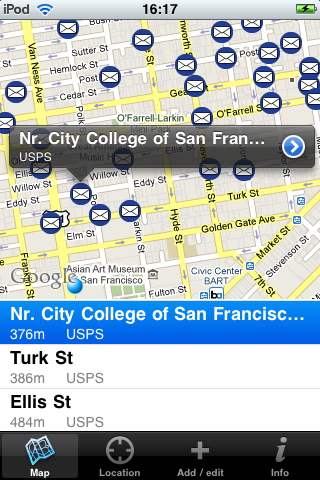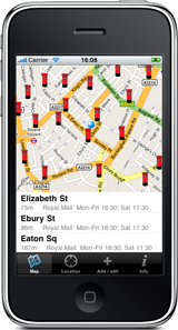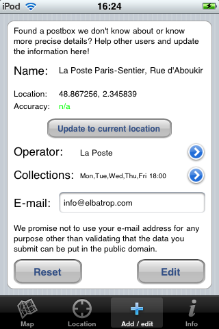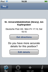 Are we missing boxes in your area? Add them straight from the app! Simply stand next to the postbox with your iPhone and press "update" to give us the coordinates, then "add" and you're done! If you want, you can enter the postal operator and the last collection times (as written on the front of the post box), but those are not required for a basic submission. We'll figure out the name of the street you're on and e-mail you to confirm your data. We'll then feed your update back into our database and add the postbox to OpenStreetMap so that the data is made openly available (including to those without an iPhone).