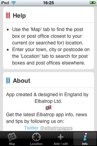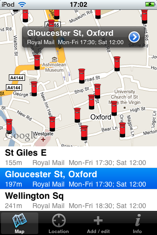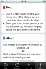 Search for postboxes and post offices around your current location, or look for a mailbox in another area via a simple place name or postcode search. Pick the box you want and call up a route map directly to it from your current location. Distances can be displayed in metric or imperial units (configured in the application preferences).