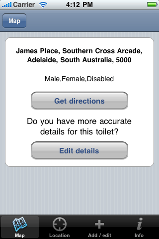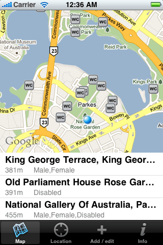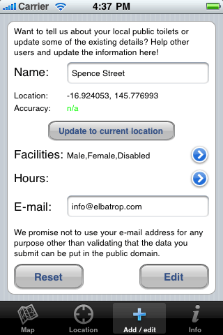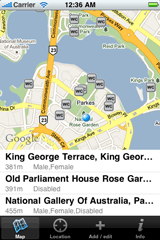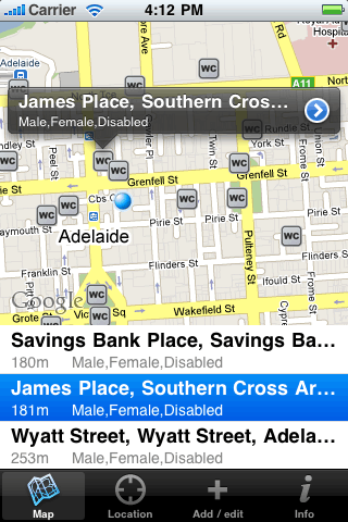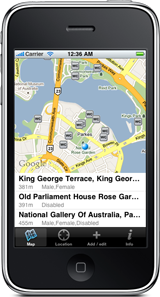 Find Toilets uses the built in GPS on the iPhone to get your current location, but can also locate an iPod Touch in built-up WiFi areas. If your location cannot be determined automatically then you can always enter your town or post code to get started. Please note that an internet connection is required to get location and map data. Australian public toilet data is copyright Commonwealth of Australia and is provided by the Department of Health and Ageing's National Public Toilet Map project. Additional and rest of world data is provided by OpenStreetMap and all edits are submitted back to this project too.