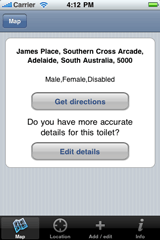 Search for public toilets around your current location using the GPS built-in to your iPhone, or look for conveniences around your destination via a simple place name or postcode search (this works for iPod Touches too). Don't waste time trying to find your way to the loo either, as once you've selected your nearest toilet this app will guide you directly to it with a customised route map! All you have to do is hold it until you get there!